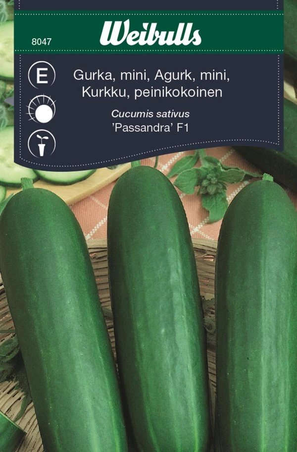 Mini, til drivhus. Udvikles/utvikles som almindelig slange-agurk, men giver/gir mange, små korte frugter. Perfekt til den lille husholdning. God frisk på smørrebrød/smørbrød eller i salater.