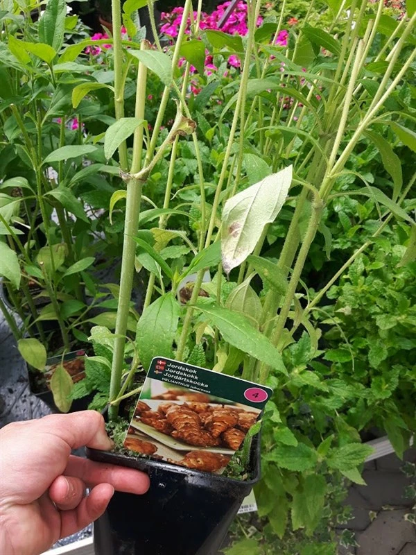 Kraftig, opret vækst med mørkegrønne store blade. Kan blomstre med små solsikke-blomster i varme somre, men det sker sjældent. Danner spiselige knolde med en lækker, nøddeagtig smag, fra underjordiske udløbere. Placering i sol eller let skygge i en almindelig, god muld.