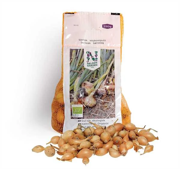 Økologisk dyrket sætteløg. Gul løg er letdyrket og måske det mest klassiske spiseløg. Denne sort har en lidt rundere form og er meget velegnet til madlavning.