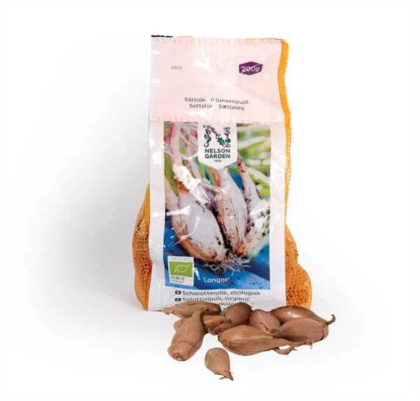 Økologisk dyrket skalotteløg. Den aflange form gør det ekstra nemt at skære. Aromatisk, og dejlig både grillet og rå. Skalotteløg vokser i knipper, og hvert sætteløg giver et nyt knippe løg.